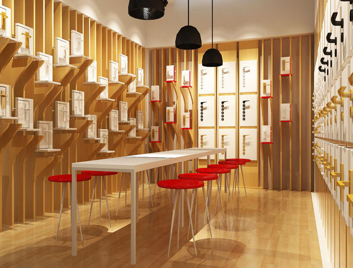 回形纹的展台,在和暖的灯光照射下渗透着时尚高雅的艺术气息。其中,在产品展示方面,雅丽斯使用了最新设计的模拟门锁架,客户通过它可以真实的感受到门锁开关时的手感和锁具表面的质感,更直观的对产品的性能做出评价。