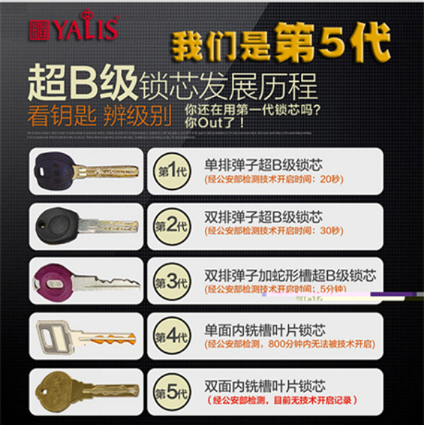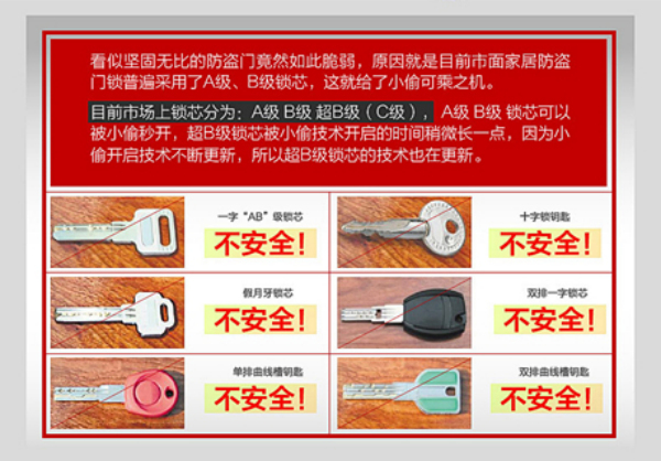 破坏性开启由于容易暴露,案件已经大为减少。技术性开启却因手法隐蔽,往往防不胜防。大多数人看到便宜就觉得实惠,而事实上,优惠是看性价比,花几百元钱买防盗门配一把几十元不到一分钟就被撬开的门锁,和每月少抽两包烟,多花点钱买一把质量过硬需要花上几小时才能撬开的门锁,谁更让人放心?也许大家一目了然。按照公安部颁布的《GA/T73-94机械防盗锁》规定,机械防盗门锁分为A级、B级、C级(超B级)锁,A级锁防技开时间不少于1分钟,B级锁防技开时间不少于5分钟,而超B级锁防技开时间大于180~270分钟。提高防盗意识,选择超B级防盗门锁是消除安全隐患的最佳选择。