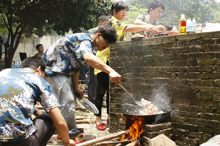 (野炊午餐)午饭时间由各队自行制作,捡柴生火,分工协作,用有限的食材做出美味的佳肴。