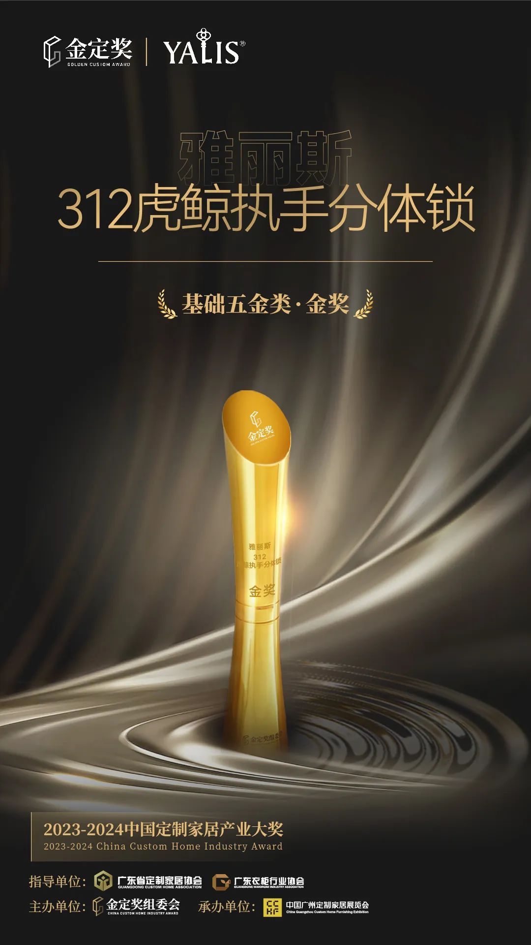在众多优秀的参赛产品中,雅丽斯的“312虎鲸”极简门锁成功脱颖而出,荣获金定奖-基础五金类·金奖!这一荣誉不仅是对我们产品品质的认可,更是对我们创新精神和不懈追求的肯定。